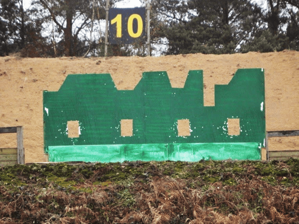 The target makes a 3 second appearance at intervals of 10 – 20 seconds at random positions in windows and crenelations on a green painted screen that resembles a castle. The Fox target is used when shooting a Sporting Rifle. What a fox is doing running around a castle and looking out of windows and over the battlements has yet to be explained.